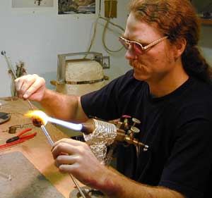 ![]() Just starting out. I am making a gather of the red glass to be used as the base color. In the background you can see the kiln I use for annealing the finished marbles. |