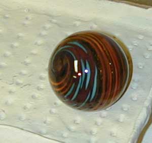 This is a set of photos I took while making my last marble of 1999, the decade, the century, the millennium!! It is an RPM with a yellow-orange-dark red-aventurine stripe, bright red base glass with turquoise "fish" make up the rest of the marble. The size is about 1-5/8 inch. This marble was made at about 11am, 31 December, 1999. You may also be interested in the Sirius Marble Gallery | |